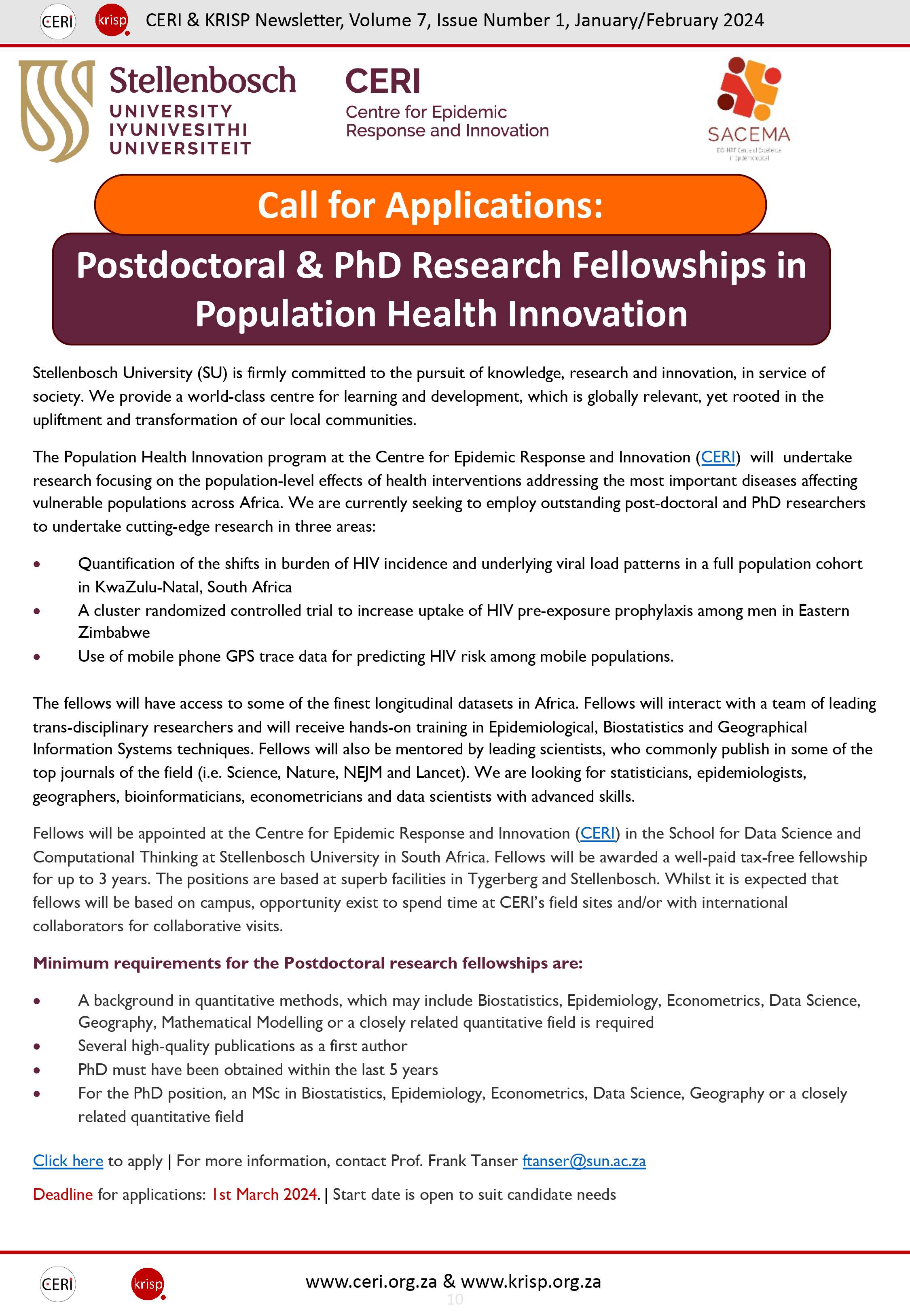 We invite applications from ambitious post doctoral scientists, to undertake research in a Flagship research programme on epidemics and modeling in South Africa. Interested candidates with background in quantitative methods, which may include Biostatistics, Epidemiology, Econometrics, Data Science, Geography, or Mathematical Modelling
