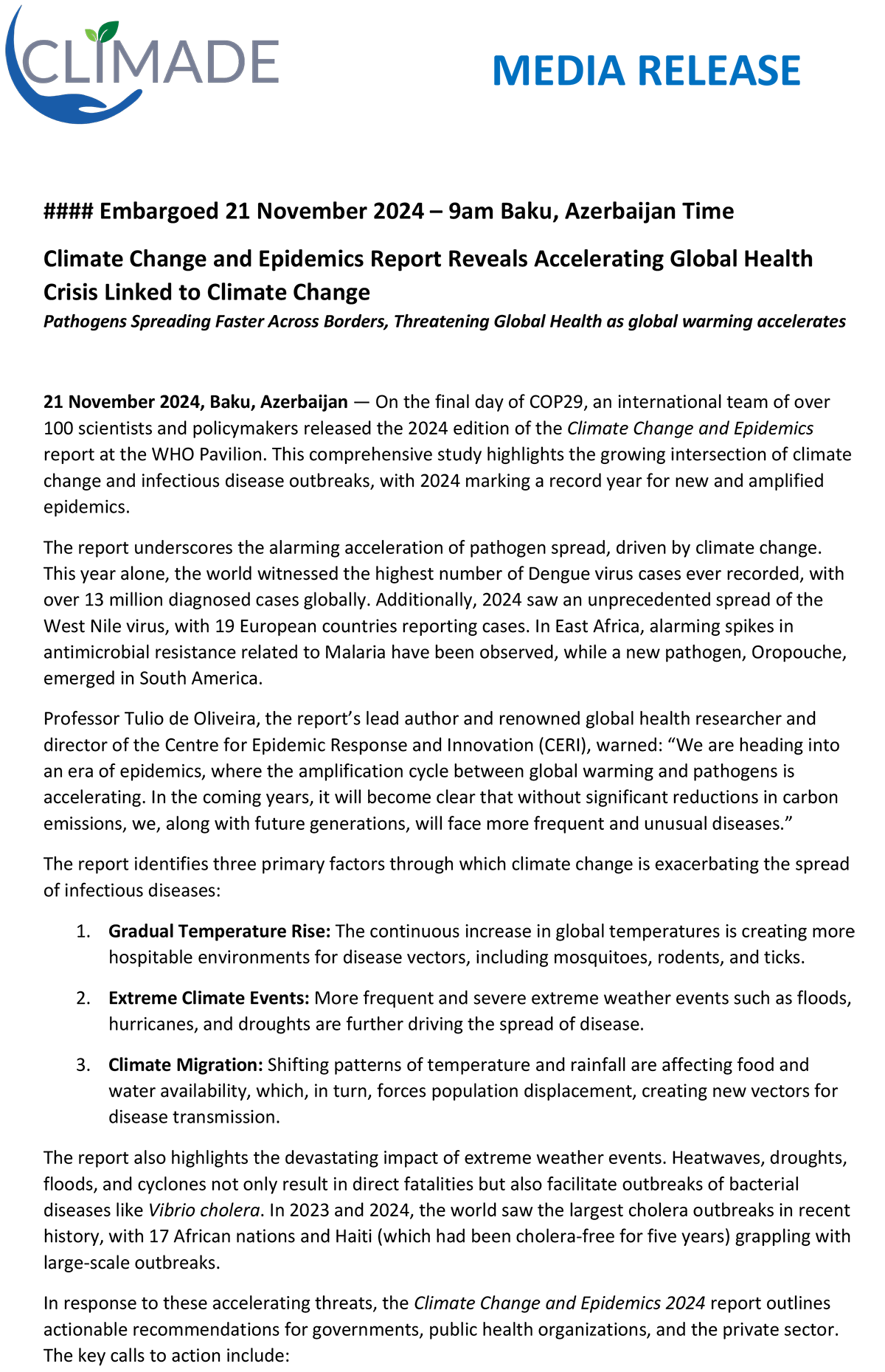 Click on the image above to download the press release for the COP29 Report Launch at the Health WHO Pavillion on the 21 November 2024.