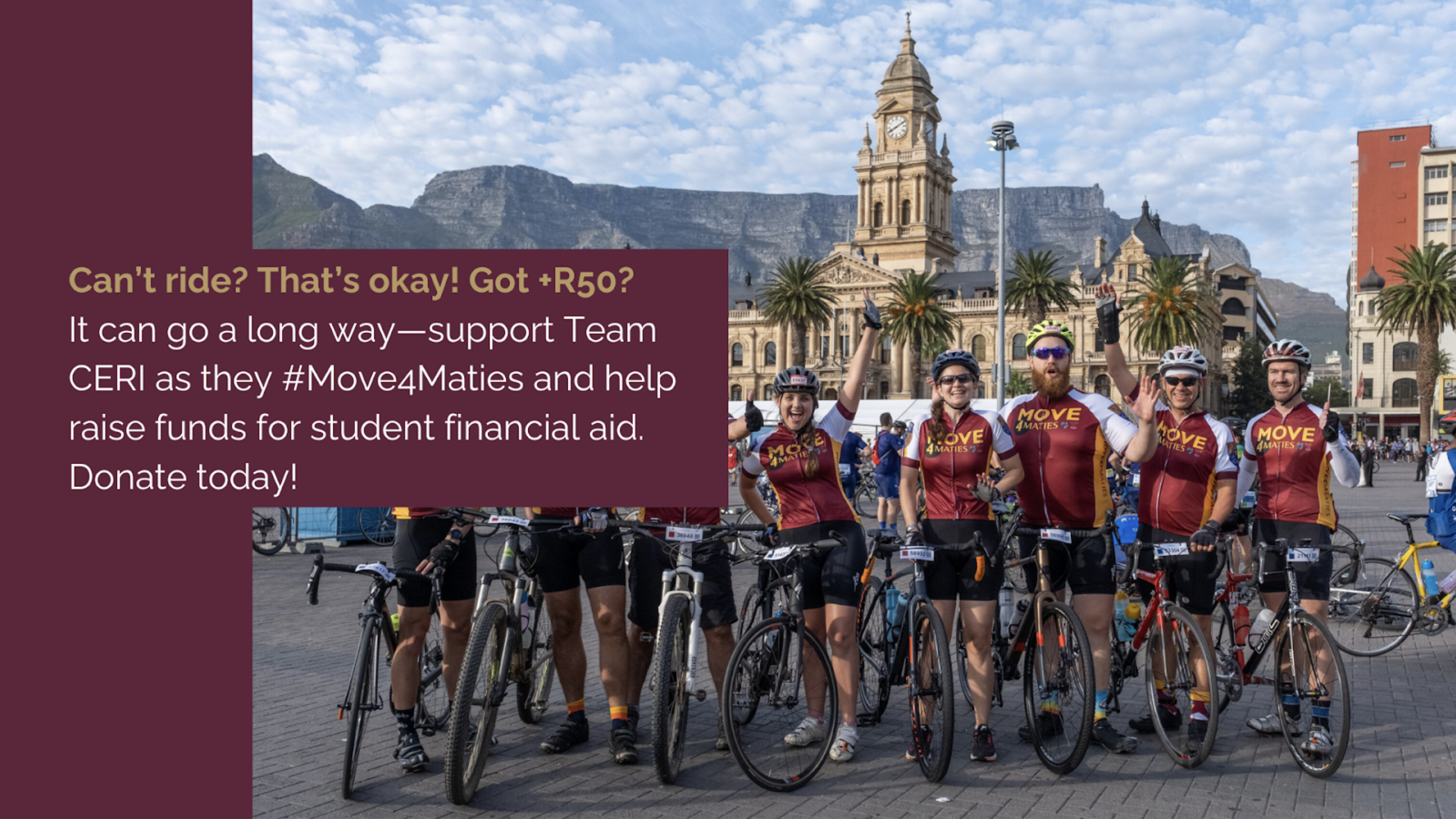 At CERI, we are deeply committed to building a better future through science, education, and community engagement. Supporting #Move4Maties aligns with our mission to drive meaningful change. By taking part in this initiative, we aim to raise awareness and critical funds to ensure that no student at Stellenbosch University is forced to abandon their education due to financial hardships.