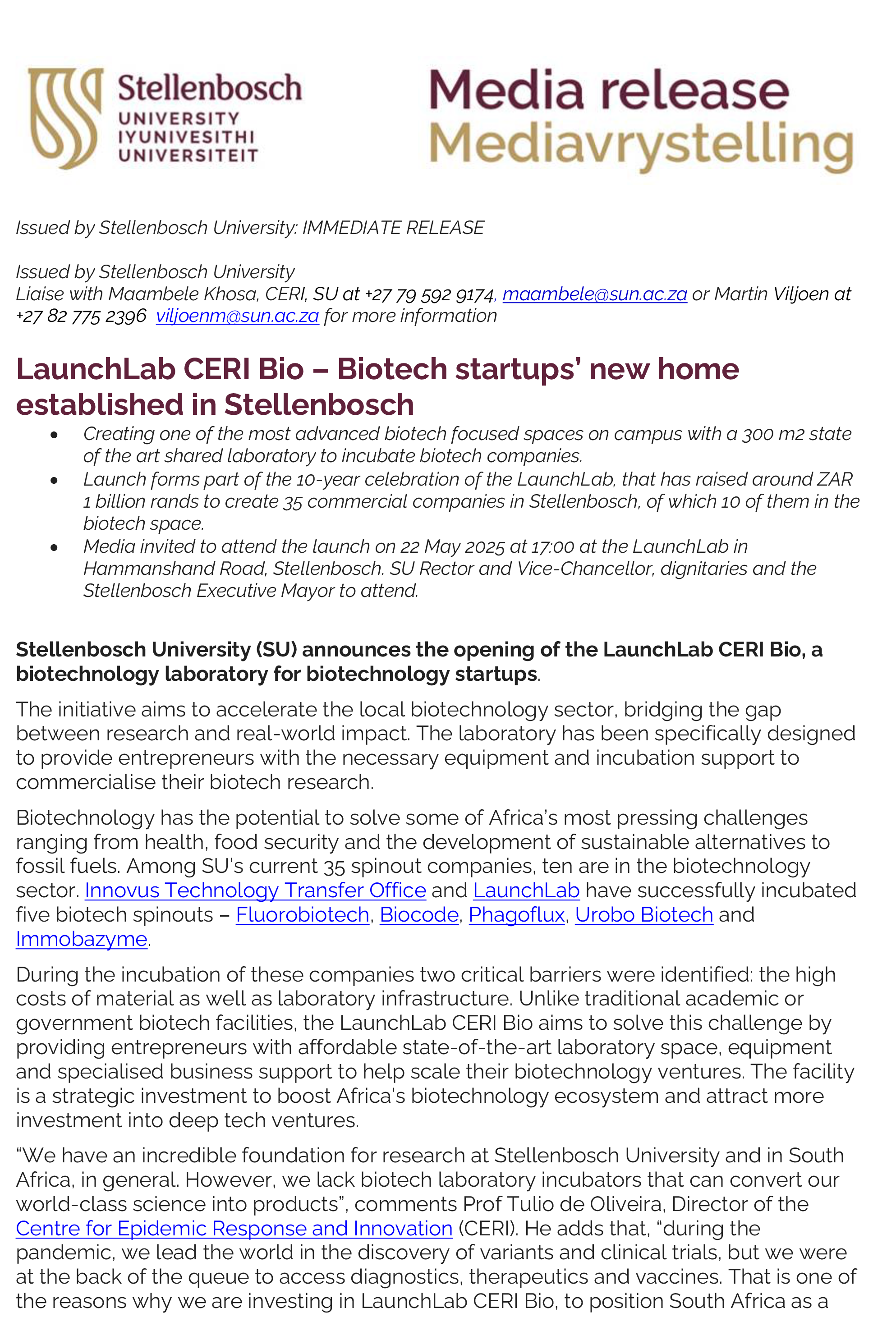 Download the press release on the Launch of the LaunchLab CERI BIO above.During the incubation of these companies two critical barriers were identified: the high costs of material as well as laboratory infrastructure. Unlike traditional academic or government biotech facilities, the LaunchLab CERI Bio aims to solve this challenge by providing entrepreneurs with affordable state-of-the-art laboratory space, equipment and specialised business support to help scale their biotechnology ventures. The facility is a strategic investment to boost AfricaÂ’s biotechnology ecosystem and attract more investment into deep tech ventures.