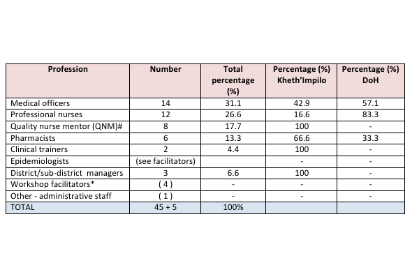 A total of 45 delegates attended the two day workshop. Four facilitators were present on each day (one from Kheth Impilo and three from the Africa Centre). There was also an events coordinator in attendance to cover delegate registration and administration. Participants were all from KwaZulu- Natal (KZN) province from the three districts that Kheth?Impilo supports. Medical doctors (31%) and professional nurses (26.6% + 17.7%) accounted for the majority of participants, together making up a total of 75% of delegates.